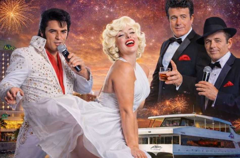 Enjoy a 3-hour dinner cruise on the Colorado River featuring breathtaking sunset views, a freshly prepared meal served in our air-conditioned dining cabin, and a full-service bar offering cocktails, beer, wine, and soft drinks for purchase. Experience unforgettable live entertainment as Marilyn Manore and her birthday guests bring the magic of Elvis Presley, Frank Sinatra, Dean Martin, Andy Williams, and Tony Bennett to life in a Rat Pack–style show filled with music, comedy, and old-school glamour. Perfect for date nights, celebrations, and groups, this scenic Laughlin dinner cruise combines classic entertainment with stunning river views for an evening you won’t forget.